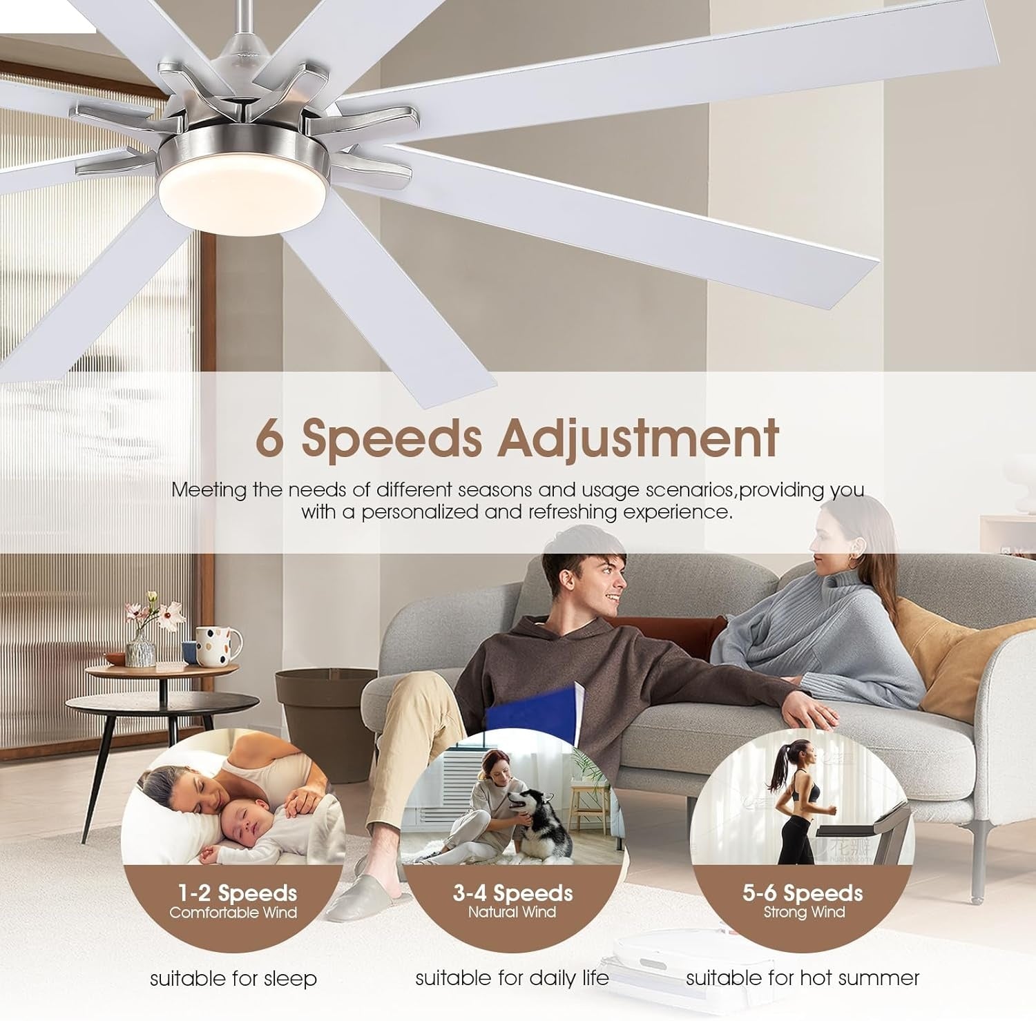 This 72-inch large ceiling fan is specially designed for spacious rooms with high ceilings, featuring eight reversible dual-finish blades to complement various home decor styles. For versatile installation, it includes both 6-inch and 10-inch downrods to accommodate different ceiling heights. With six adjustable speed settings, this powerful yet quiet fan delivers optimal airflow to meet all your cooling and circulation needs, making it perfect for living rooms, great rooms, and other large spaces.